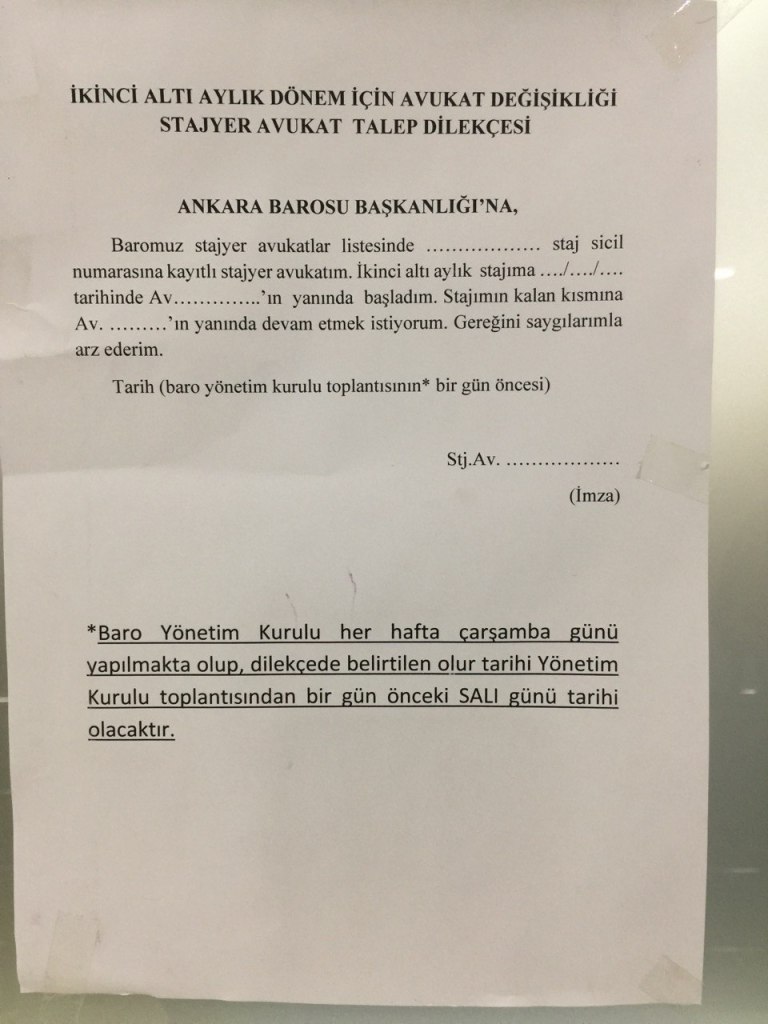 Ankara Barosu stajınızı başlatırken ikinci altı ay yanında staj yapacağınız avukattan Olur Belgesi istiyor. (bkz. 7)