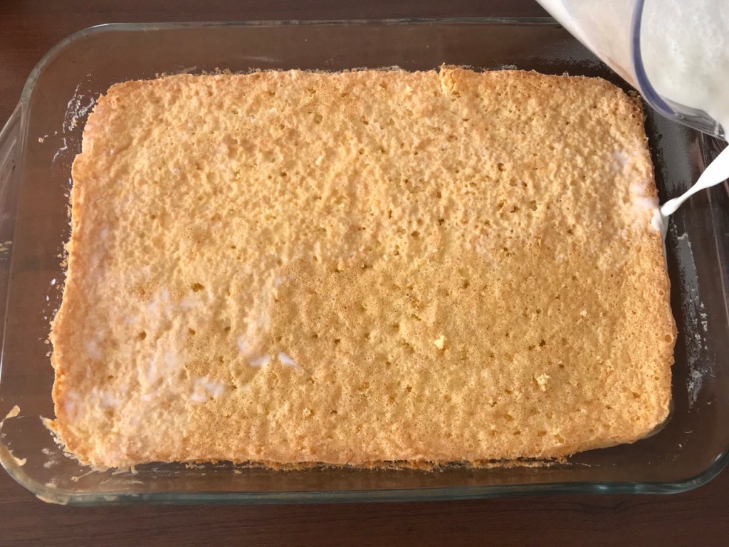 Kek fırından çıkıp biraz soğuduktan sonra kürdan yardımıyla üzerinde sık delikler açılıp. Keki ıslatmak için hazırladığımız malzeme eşit olarak keke yedirilir.