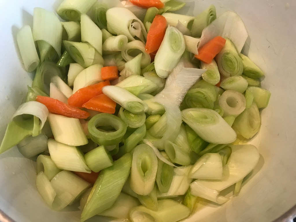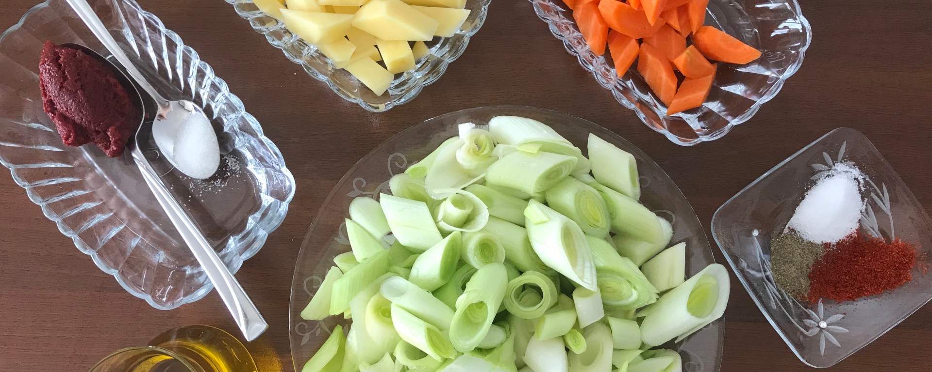 Havuç, patates ve pırasa yıkanıp doğranır.
