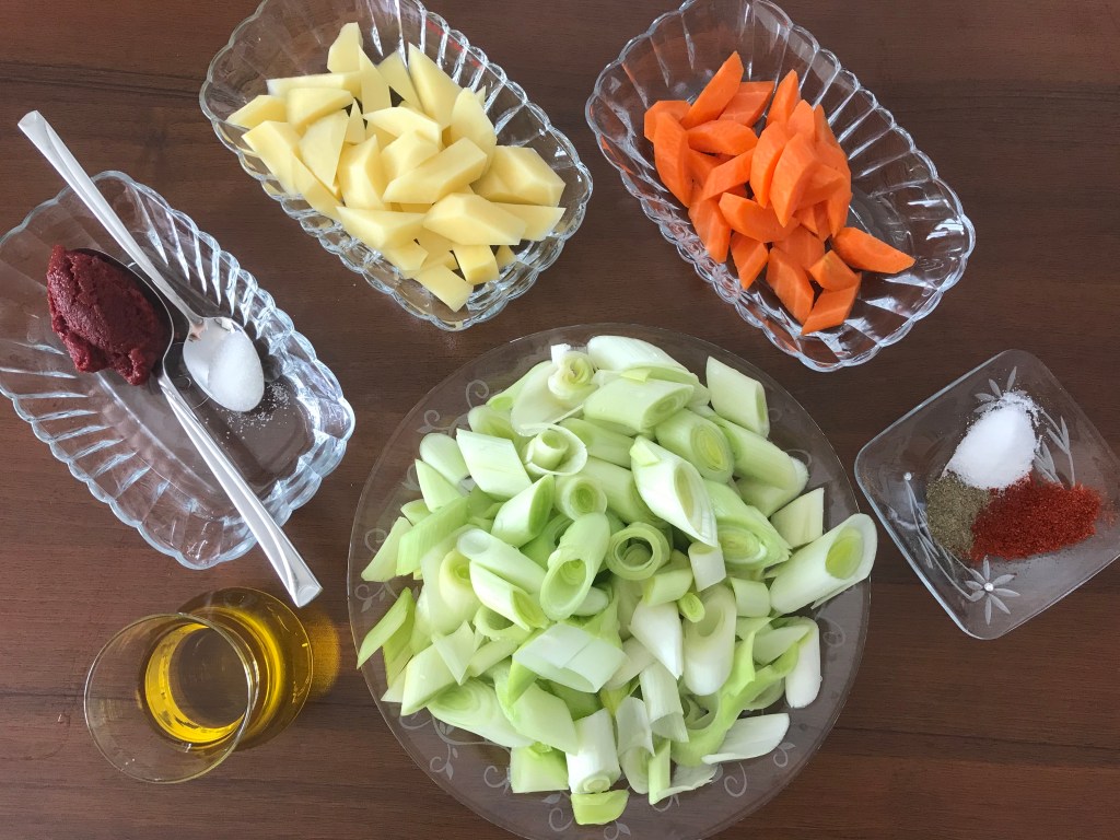 Pırasa havucun üzerine eklenip sotelenir. Sonra patates eklenir. Salça, tuz, karabiber, şeker ve pul biber eklenir.