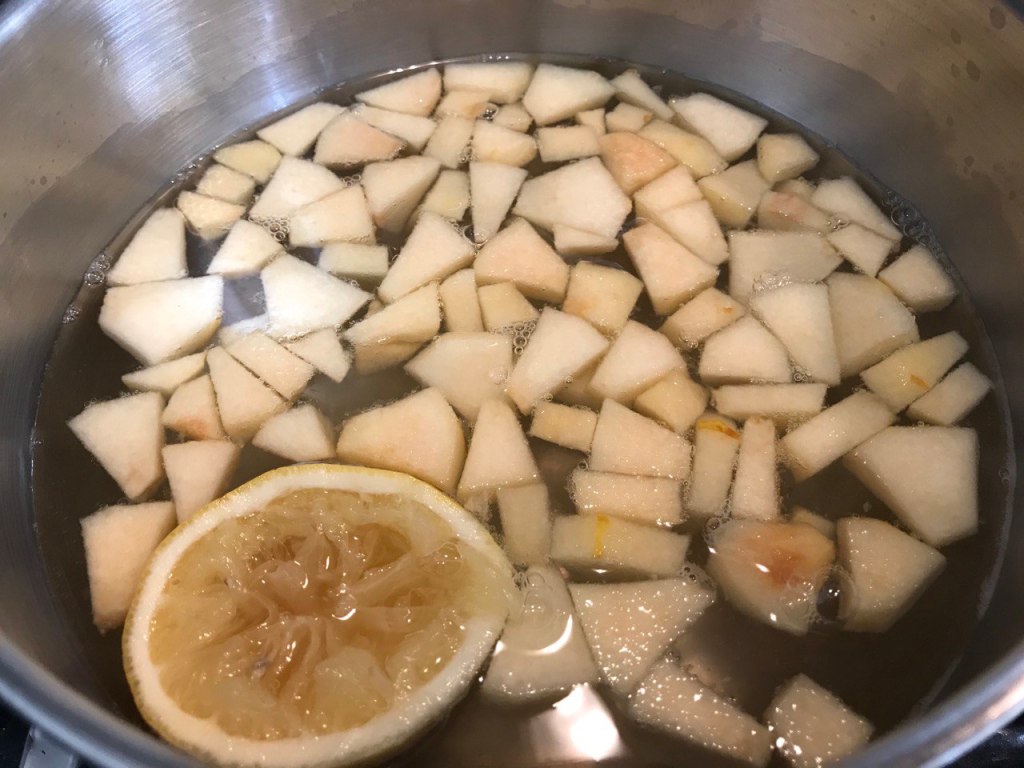 Bir limonun kabuğunu rendeleyin ve ortadan ikiye kesin. 3 bardak suyu tencereye koyup limonun yarısını sıkarak posasını da içine atın. Kabuğu soyulup doğranmış ayvaları bu suyun içine koyun. Tencerenin kapağını kapatarak ayvaları haşlanmaya bırakın.