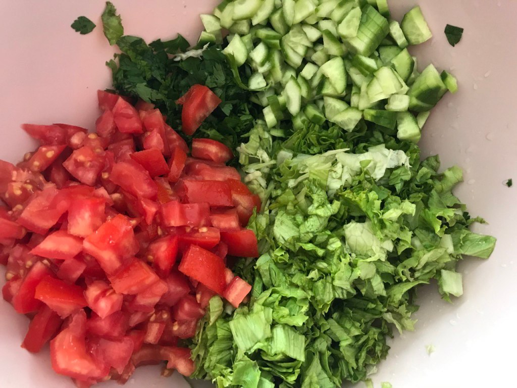 Domates, salatalık, marul ve maydonoz yıkanıp doğranır. Malzemeli bulgurun üzerine eklenir, kaşıkla karıştırılır.