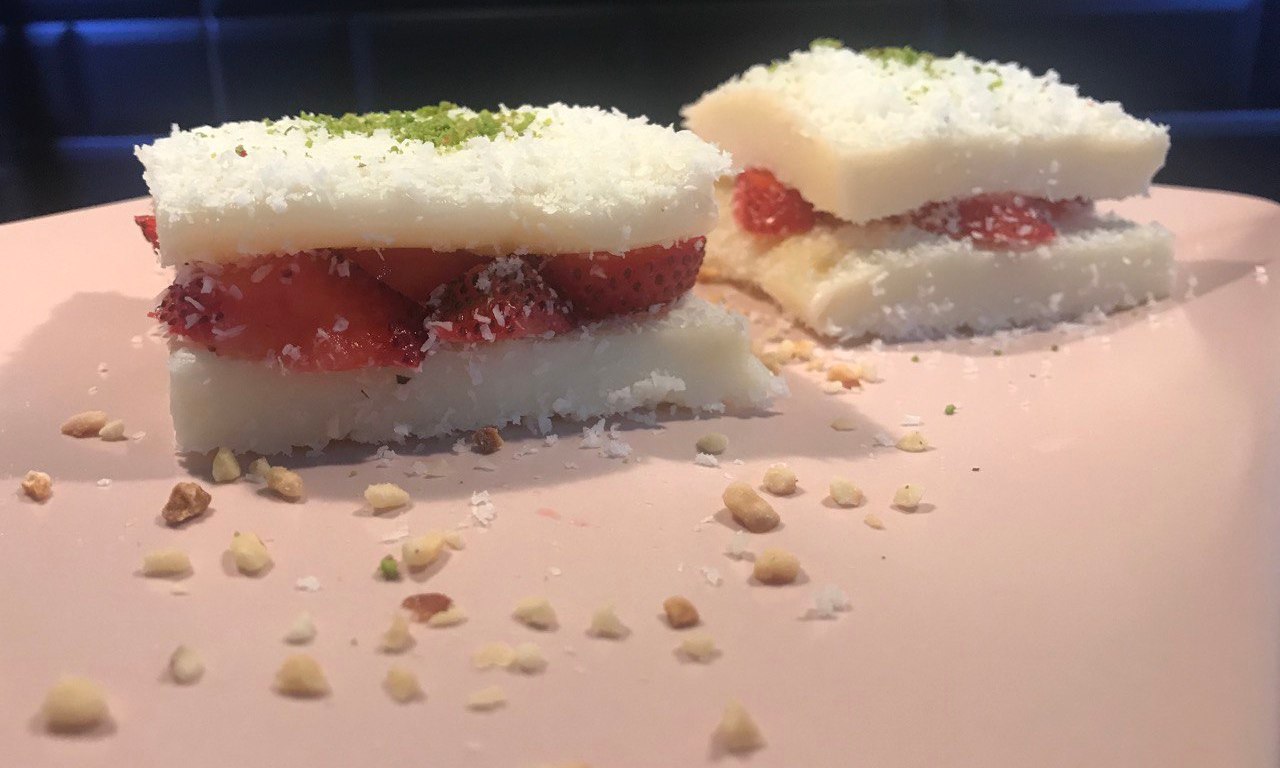 Kareler şeklinde bölüp aralarına doğranmış çilek ve fındık serpiştirdik. Orijinal tarife benzemesi için üzerine de tekrar antep fıstığı tozu serptik.