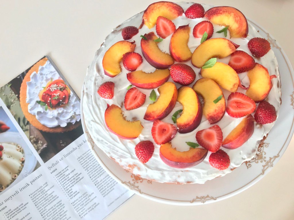 Yemek tarifi dergilerine göz gezdirip resmi güzel olanları denemeyi seviyorum. Bugün de yaklaşan yazın habercisi olan bir meyveli kek tarifi denemek istedim.
