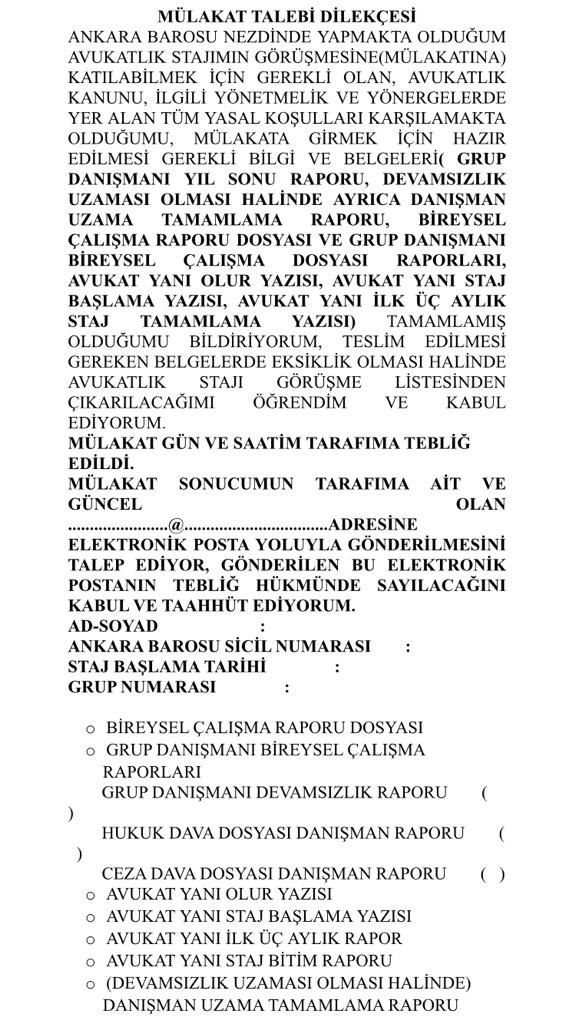 4- Danışmanınız sizinle ilgili raporu hazırlayıp Baro’ya ilettikten sonra aşağıda örneği yer alan Mülakat Talebi Dilekçesini candan.cuhadar@ankarabarosu.org.tr adresine gönderin ve mülakat gününüzün size gönderilmesini bekleyin.