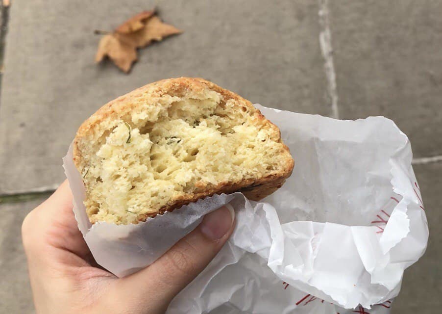 Sonra yine aynı yolun devamında GAIL’s Bakery’de varmış, yine orası da tavsiye edilen yerler listemizdeydi. Bu sefer artık tuzlu bir şeyler alalım dedik. İç mekan oldukça güzeldi ama kalabalıktı. Daha tenha olan bir günde kesinlikle içeride biraz vakit geçirilebilir. Ürünleri de içeride oturarak yerseniz daha fazla ödemeniz gerekiyor. Biz birer dereotlu poğaçaya benzeyen Chedar & Chive Drop Scone ve Cheese Straw aldık. Bize göre ilki ikincisinden daha güzeldi.